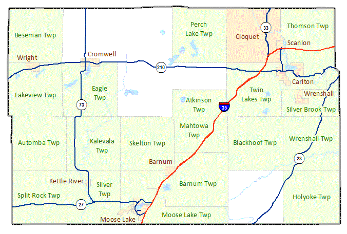 Carlton County is located in northeastern Minnesota and was established on May 23, 1857 by the Territorial Legislature. Carlton is named for Reuben B. Carlton, a farmer and early settler of Fond du Lac who was a blacksmith for the Ojibwe. Carlton served in the 1st State Legislature (SD 26, 1857-1859). The city of Carlton is the county seat. Source: Minnesota Geographic Names, by Warren Upham (Minnesota Historical Society, 1969).