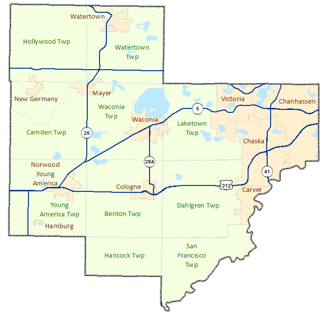 Carver County is located in the Twin Cities metropolitan area and was established on February 20, 1855 by the Territorial Legislature. Carver County is named for 18th Century explorer Jonathan Carver who wrote about his travels in Minnesota in his book "Travels Through the Interior Parts of North America in the Years 1766, 1767, 1768." Chaska in the county seat. Source: Minnesota Geographic Names, by Warren Upham (Minnesota Historical Society, 1969).