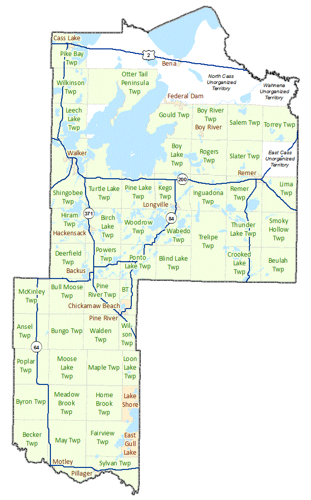 Cass County is located in North Central Minnesota and was established on September 1, 1851 by the Territorial Legislature. Cass County is named for Brigadier General and explorer Lewis Cass who also served as Michigan Territorial Governor (1813-1831), U.S. Secretary of War (1831-1836), U.S. Minister to France (1836-1842), Michigan U.S. Senator (1845-1848), 1849-1857), and U.S. Secretary of State (1857-1860). Walker is the county seat. Sources: Minnesota Geographic Names, by Warren Upham (Minnesota Historical Society, 1969). Biographical Directory of the United States Congress.