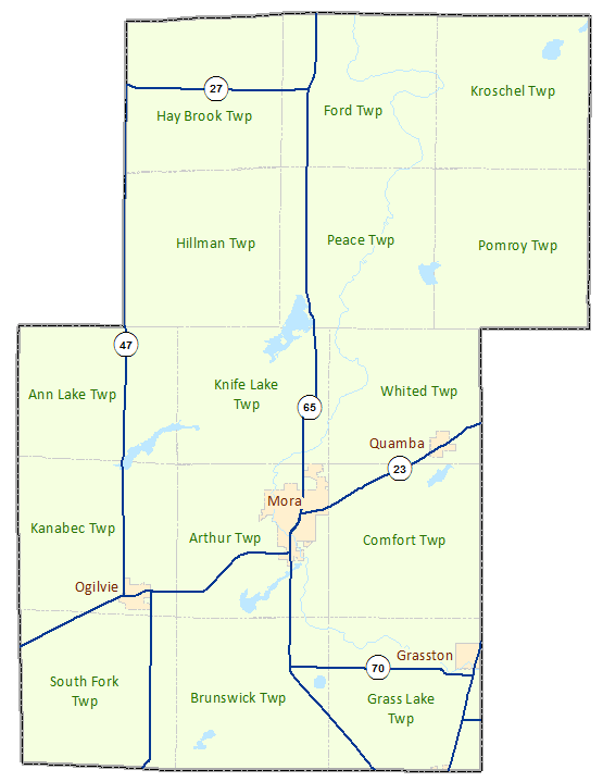 Kanabec County is located in East Central Minnesota and was established on March 13, 1858 by the Territorial Legislature. Kanabec County was named by state legislator William Folsom of Taylors Falls after the Ojibwe word for "snake," since the Snake River winds north to south through the county. Mora is the county seat. Sources: Kanabec History Center website. Minnesota Geographic Names, by Warren Upham (Minnesota Historical Society, 1969).