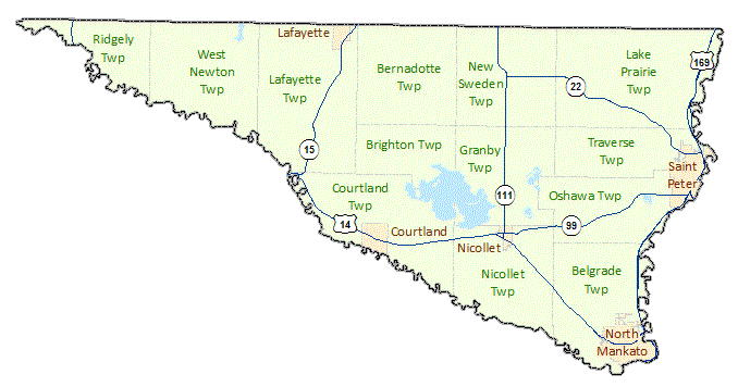 Nicollet County is located in South Central Minnesota and was established on March 5, 1853 by the Territorial Legislature. Nicollet County was named after French explorer Joseph Nicolas Nicollet who published a map of the area in 1843. Saint Peter is the county seat. Sources: Nicollet County website. Minnesota Geographic Names, by Warren Upham (Minnesota Historical Society, 1969).