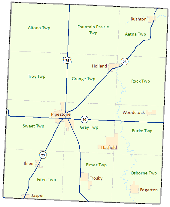 Pipestone is located in Southwestern Minnesota along the South Dakota border and was established on May 23, 1857 by the Territorial Legislature. Pipestone County is named for its red pipestone from which pipes were made by Native Americans. Pipestone is the county seat. Source: Minnesota Geographic Names, by Warren Upham (Minnesota Historical Society, 1969).