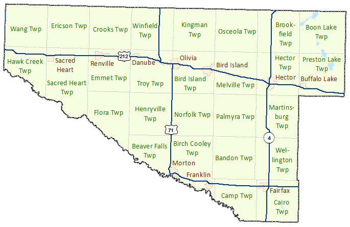 Renville County is located in South Central Minnesota and was established on February 20, 1855 by the Territorial Legislature. Renville County is named for guide, interpreter, and trading post operator Joseph Renville, whose mother was a Dakotah. Olivia is the county seat. Sources: Renville County website. Minnesota Geographic Names, by Warren Upham (Minnesota Historical Society, 1969).